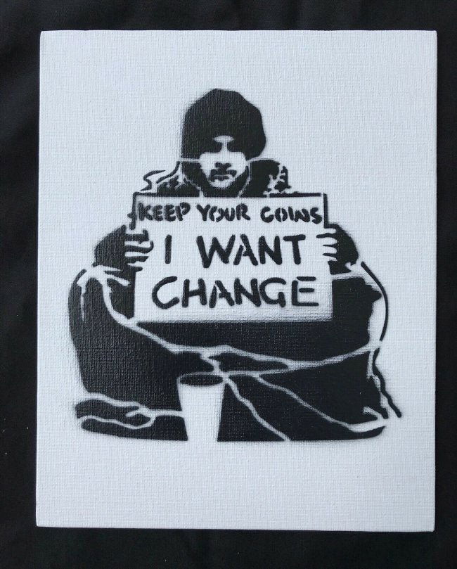 Anonymous On Twitter Banksy We Can T Do Anything To Change The World Until Capitalism Crumbles In The Meantime We Should All Go Shopping To Console Ourselves Https T Co Iidu0fahva from pbs.twimg.com 5 out of 5 stars (48) 48 reviews $ 12.20. Sparing some loose change for a homeless person can help them in the short term; Practice humility, and you will naturally earn respect without having to mistreat anyone. Speculation is mounting that banksy was at extinction rebellion's london protests after the appearance of a mural at the group's marble arch base. By painting keep your coins, i want change, banksy utilizes the double meaning of the word change and takes a familiar image and turns it on its head in order to make a larger point. With wry wit and stealth, banksy merged graffiti art with installation and performance. The new work, depicting a child holding a balloon with the. Check out our banksy change selection for the very best in unique or custom, handmade pieces from our prints shops.